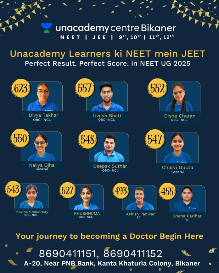 विनय एक्सप्रेस समाचार, बीकानेर।कांता खतुरीया कॉलोनी में पजाब नेशनल बैंक के पास स्थित राष्ट्रीय स्तर का शिक्षण संस्था अनएकेडमी के बीकानेर सेंटर के विद्यार्थियों ने नीट 2025 की प्रतियोगी परीक्षा परीणाम में धूम मचा दी है इस वर्ष कठिन परीक्षा के बावजूद भी संस्थान से कुल 25 विद्यार्थियों का नीट में चयन हुआ है । संस्थान के अकादमिक निदेशक जुगल सिह चारण ने बताया कि बच्चां की मेहनत एवं अनुभवी शिक्षकों की लगन से आज अनएकेडमी के बीकानेर सेण्टर से सुखद परीणाम देखने को मिल रहा है।