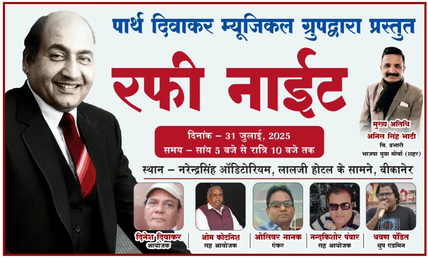 विनय एक्सप्रेस समाचार, बीकानेर।पार्श्व गायक मोहम्मद रफी की 45वीं पुण्यतिथि के अवसर पर पार्थ दिवाकर म्यूजिकल ग्रुप द्वारा “रफी नाइट” का भव्य संगीत कार्यक्रम का आयोजन 31 जुलाई 2025 को आयोजित किया जाएगा। यह कार्यक्रम नरेंद्रसिंह ऑडिटोरियम, लालजी होटल के सामने, बीकानेर में शाम 5 बजे से रात्रि 10 बजे तक आयोजित होगा। इस विशेष संगीत समारोह में अनिल सिंह भाटी मुख्य अतिथि के रूप में शिरकत करेंगे।