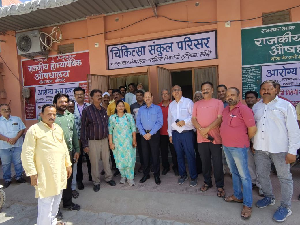विनय एक्सप्रेस समाचार, बीकानेर । रानी बाजार चौपड़ा कटला स्थित चिकित्सा संकुल परिसर में सोमवार को संभागीय आयुक्त विश्राम मीणा ने विभिन्न चिकित्सा व्यवस्थाएं देखी और समिति के साथ इस कार्य में सहयोग दे रहे भामाशाहों की सराहना भी की। विश्राम मीणा परदेशियों की बगेची मुक्तिधाम समिति के प्रबंधक राजीव शर्मा और व्यवस्थापक दिनेश वत्स के विशेष आग्रह पर चिकित्सा संकुल का निरीक्षण किया। इस दौरान उन्होंने होम्योपैथी चिकित्सक डॉ. इन्द्रा भादू से चिकित्सालय में प्रतिदिन आने वाले आउटडोर मरीजों की संख्या के बारे में जानकारी ली। इतनी संख्या में मरीज आने की सूचना पर हैरानी जताने के साथ उन्होंने चिकित्सालय के मरीज रिकॉर्ड रजिस्टर को देखकर आश्चर्य व्यक्त किया और निर्बाध रूप से दी जा रही सुविधाओं पर प्रसन्नता भी जताई। इस दौरान संभागीय आयुक्त ने एलोपैथी चिकित्सक डॉ. पी के सरीन, आयुर्वेद चिकित्सक डॉ अशोक सुथार, आयुर्वेद की डॉ. गीता कुमारी और योगा के चिकित्सक डॉ. राम शर्मा से वार्ता कर संपूर्ण कक्षों का अवलोकन किया तथा वहां मौजूद चिकित्सा व्यवस्था को देख संतोष व्यक्त किया। समिति के राजीव शर्मा ने एलोपैथी चिकित्सा के साथ संकुल परिसर में लैब स्थापित करने की माँग भी की । राजीव शर्मा ने बताया कि चिकित्सा संकुल के पास बड़े भू भाग में स्लम एरिया है । इसके लिए यहाँ लैब की स्थापना आवश्यक है । इस दौरान संभागीय आयुक्त के साथ योगेश भार्गव ने योग उद्यान में दो औषधी के पौधे रोपित कर उनमें पानी दिया। इस दौरान समिति के प्रबंधक राजीव शर्मा ने प्रशासन और नगर निगम के साथ चिकित्सा संकुल के संयुक्त तत्वावधान में चौपड़ा कटला स्थित खाली परिसर में पौधा वितरण केन्द्र बनाने की अनुमति मांगी। इस पर संभागीय आयुक्त विश्राम मीणा ने इस संदर्भ में हर संभव सहयोग का आश्वासन दिया। चिकित्सा संकुल की संपूर्ण व्यवस्थाओं को देखने के बाद संभागीय आयुक्त ने साथ आए निगम उपायुक्त यशपाल आहूजा और इंसपेक्टर नेक मोहम्मद से स्वतन्त्रता दिवस पर १५ अगस्त को संपूर्ण चिकित्सा संकुल को रोशनी से सजाने के निर्देश भी दिए। चिकित्सा संकुल पहुंचे संभागीय आयुक्त विश्राम मीणा, निगम उपायुक्त यशपाल आहूजा, नगर निगम की कनिष्ठ अभियंता मंजू सहारण, इंसपेक्टर नेक मोहम्मद का समिति की ओर से बुके भेंट कर स्वागत किया गया।