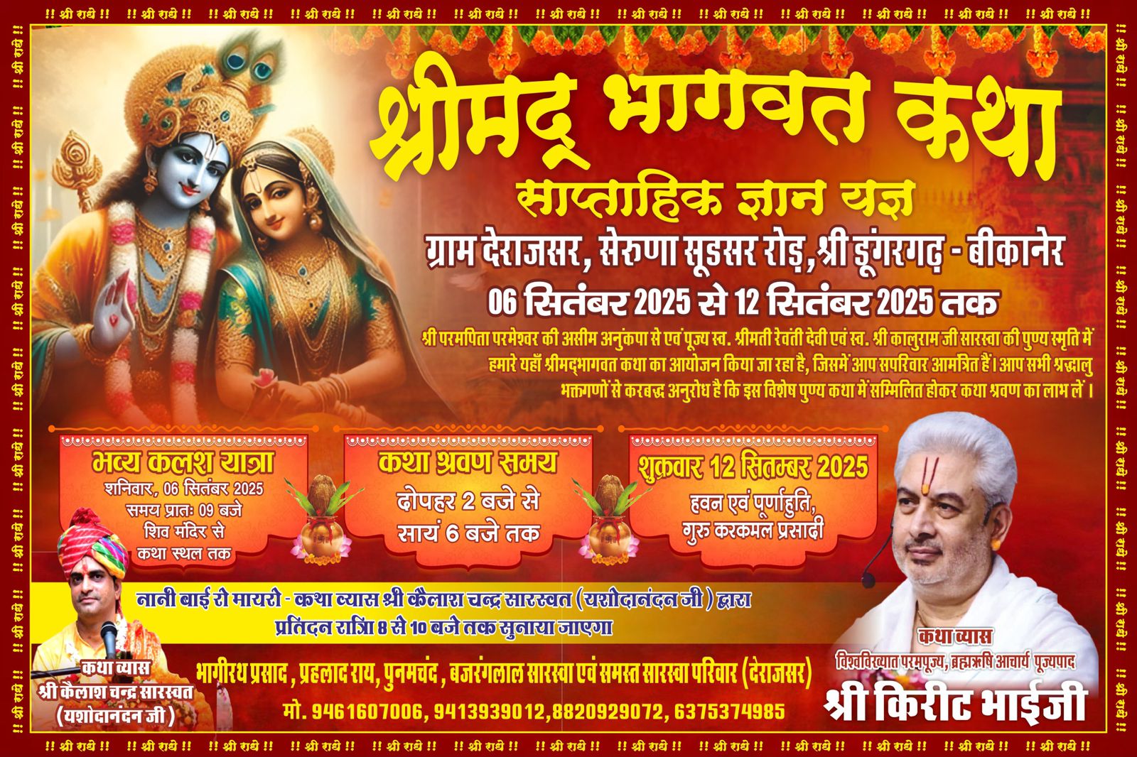 विनय एक्सप्रेस समाचार,बीकानेर। धर्म नगरी बीकानेर के श्री डूंगरगढ़ तहसील के गांव देराजसर में श्रीमती रेंवती देवी एवं स्वर्गीय श्री कालुराम सारस्वा की स्मृति में उनके परिजनों द्वारा 6 सितम्बर से सनातन धर्मप्रेमियों के लिए श्रीमद् भागवत सप्ताह ज्ञान यज्ञ का आयोजन सारस्वा परिवार द्वारा किया जाएगा। इस कथा का वाचन विश्वविख्यात परमपूज्य, ब्रहऋषि आचार्य पूज्यपाद श्री किरीट भाईजी करेंगे। आयोजनकर्ता भागीरथ प्रसाद सारस्वा ने बताया कि शनिवार 6 सितम्बर को दोपहर 2 बजे से शाम 6 बजे तक कथा का वाचन श्री किरीट भाई जी द्वारा किया जाएगा। इससे पहले शिव मंदिर, देराजसर से भव्य कलश यात्रा निकाली जाएगी। यह कलश यात्रा सुबह 9 बजे गाजे-बाजों के साथ महिलाओं द्वारा केसरिया साड़ी में सर पर कलश धारण कर एवं पुरुषों द्वारा सनातन धर्म के जयकारों के साथ निकाली जाएगी जो कथा स्थल पर पहुंचकर विराम लेगी। आयोजनकर्ता प्रह्लादराय सारस्वा ने बताया कि कथा को लेकर बजरंग युवा मंडल के नेतृत्व में तैयारियों को अंतिम रूप दिया जा रहा है। पूनमचंद सारस्वा ने बताया कि कथा का विराम 12 सितम्बर को दोपहर 1 बजे विधि विधान से किया जाएगा।