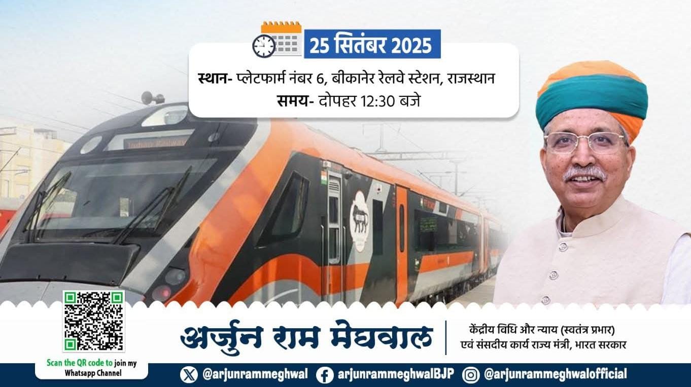 विनय एक्सप्रेस समाचार, बीकानेर. केंद्रीय विधि एवं न्याय मंत्री अर्जुनराम मेघवाल गुरुवार प्रात 7:20 बजे रेलमार्ग से बीकानेर पहुंचेंगे। मेघवाल सेवा पखवाड़े के तहत सांसद सेवा केंद्र में प्रातः 10 बजे आयोजित होने वाले कार्यक्रम में भाग लेंगे। दोपहर 1 बजे बीकानेर रेलवे स्टेशन पर वंदे भारत एक्सप्रेस के शुभारंभ कार्यक्रम में मौजूद रहेंगे। मेघवाल विभिन्न कार्यक्रमों और बैठकों में शिरकत करने के बाद रात्रि 10:20 बजे रेल मार्ग द्वारा दिल्ली के लिए प्रस्थान करेंगे।