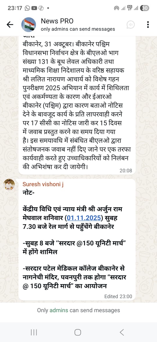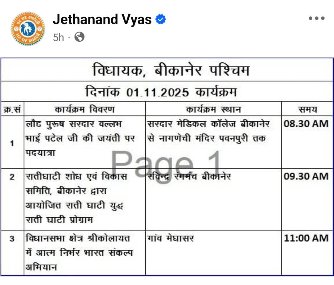 सूचना एवं जनसंपर्क कार्यालय बीकानेर के जनसंपर्क अधिकारी सुरेश बिश्नोई ने बीकानेर जिले के प्रेस प्रतिनिधियों को अपडेट देते हुए बताया कि केंद्रीय मंत्री अर्जुन मेघवाल सरदार पटेल की जयंती पर शनिवार सुबह 8:00 बजे पदयात्रा का नेतृत्व करेंगे। यह पदयात्रा एसपी मेडिकल कॉलेज से प्रारंभ होकर पवनपुरी स्थित नागणेची की माताजी मंदिर तक चलेगी। बिश्नोई ने कहा, “यह राष्ट्रीय एकता दिवस के उपलक्ष्य में आयोजित कार्यक्रम का हिस्सा है.