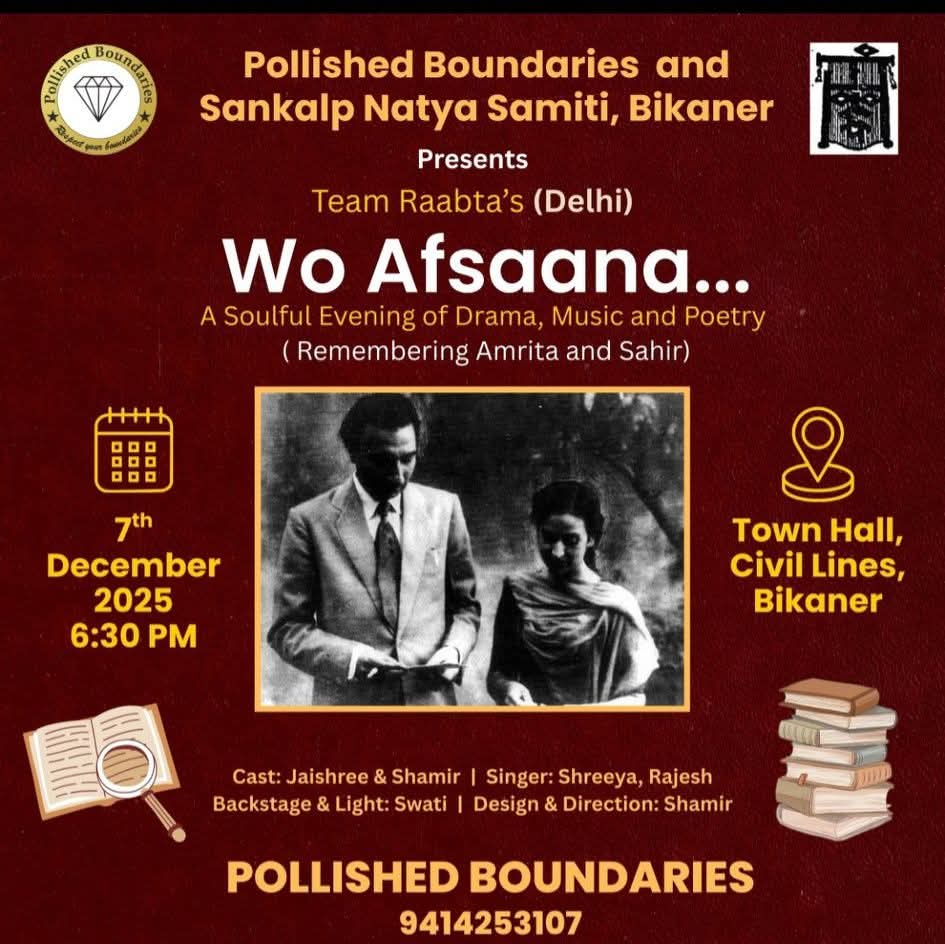 विनय एक्सप्रेस समाचार, बीकानेर।पॉलिश्ड बाउंड्रीज़ एवं संकल्प नाट्य समिति, बीकानेर द्वारा साहित्यकार साहिर लुधियानवी और अमृता प्रीतम की स्मृतियों पर आधारित संगीतमय नाट्य प्रस्तुति “वो अफ़साना…” का मंचन 07 दिसम्बर 2025 को शाम 06:30 बजे टाउन हॉल, बीकानेर में किया जाएगा।