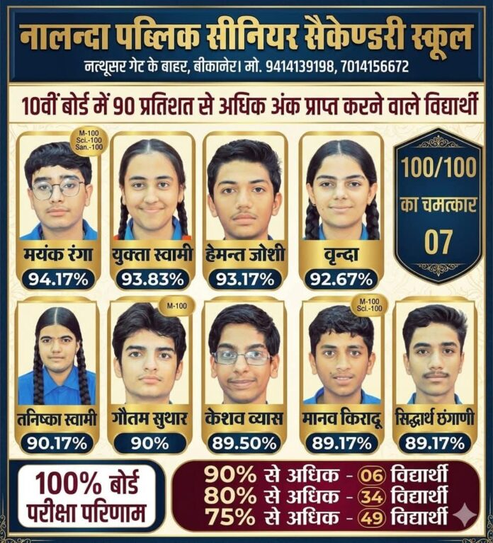 नालन्दा पब्लिक सीनियर सेकेंडरी स्कूल, नथूसर गेट के बाहर, बीकानेर के प्रबंधन ने सभी सफल विद्यार्थियों, शिक्षकों और अभिभावकों को बधाई दी है। स्कूल ने कहा कि यह परिणाम कड़ी मेहनत, बेहतरीन शिक्षण पद्धति और विद्यार्थियों के समर्पण का नतीजा है।