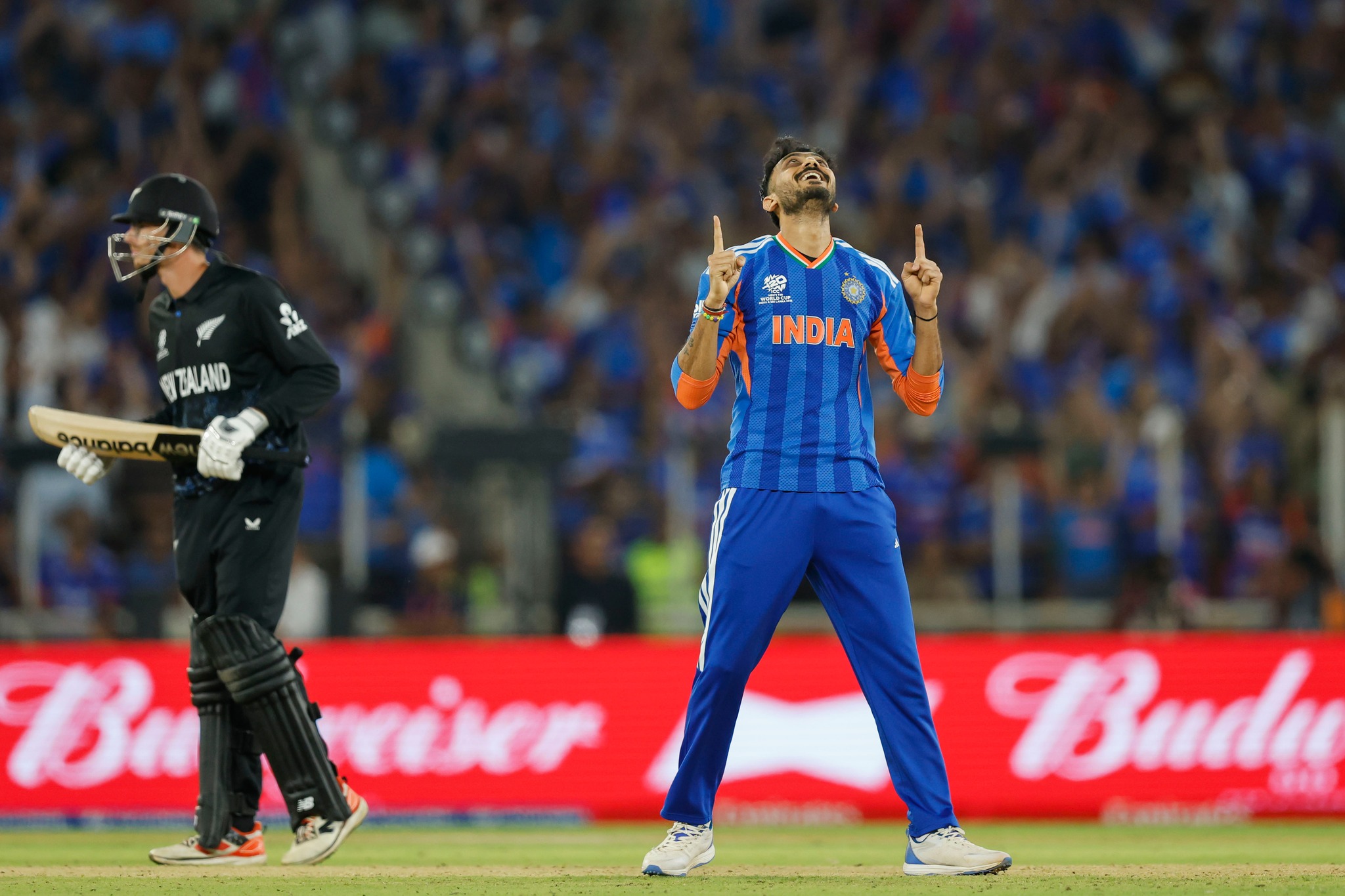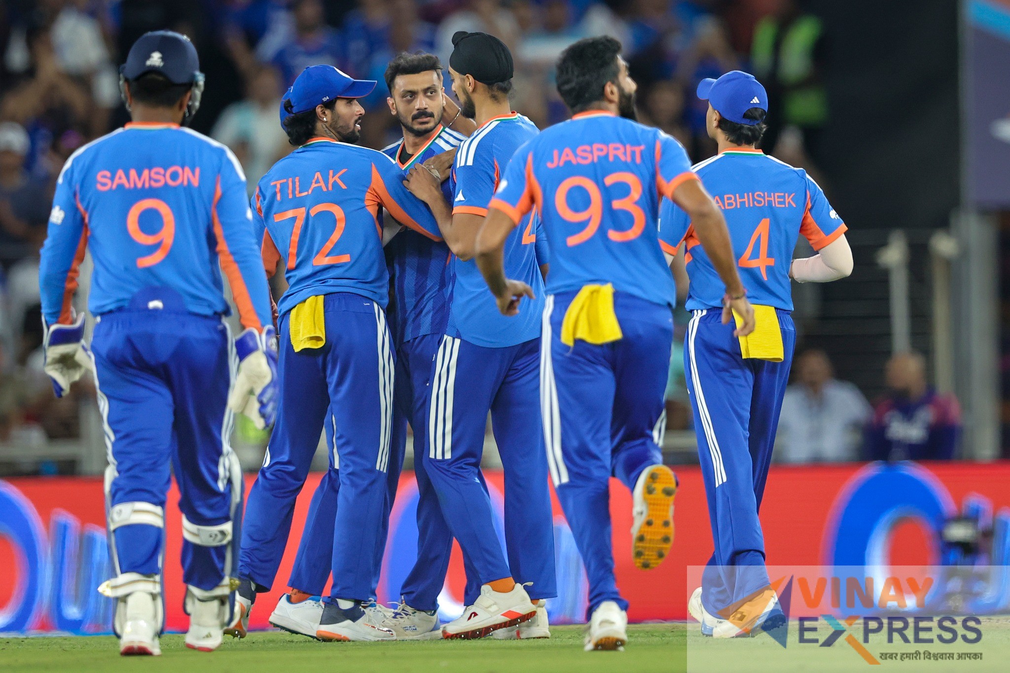 अंतिम विकेट अभिषेक शर्मा ने लिया – जैकब डफी को तिलक वर्मा ने लॉन्ग-ऑन पर शानदार कैच पकड़ा। इसी पल स्टेडियम में 1 लाख+ दर्शकों ने “भारत माता की जय” के नारे लगाए और पूरे देश में जश्न का माहौल छा गया। 2023 के वनडे WC फाइनल का बदला पूरा हो गया!
